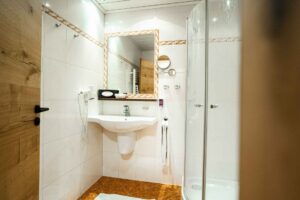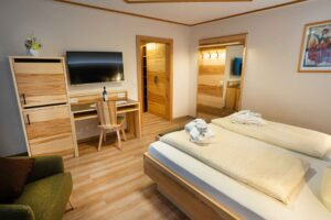 Unser Doppelzimmer Enzian bietet mit 23 m² Platz für maximal 2 Erwachsene und 1 Kind. Das Zimmer befindet sich in unserem Gästehaus und überzeugt mit eigenem Balkon oder Terrasse. In heller und moderner Atmosphäre geben wir Ihnen einen Raum zum Durchatmen. Ausgestattet ist das Doppelzimmer mit Dusche und WC, Haarföhn, Kosmetikspiegel, Sat-TV, Safe, Kühlschrank, Sitzecke, Telefon und Radio. Bettengröße: 1,80 x 2,00 m